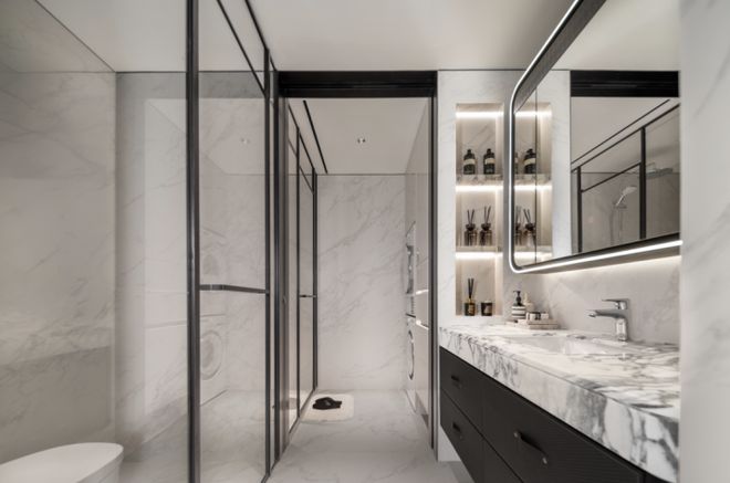 爱马仕级的奢皮质感,让豪宅居住每一寸细节都耐得住时间的品味!客厅以意大利头层小牛皮包裹,精致车缝线如奢侈品包袋细节,与大理石台面碰撞出柔与刚的平衡;主卧背景墙编织皮革灵感源自文华东方酒店,靠上去便卸下所有疲惫;主卫台盆柜以柔韧防潮皮革四季恒温,这种高级到每一处的品质真是把外滩瑞府的审美拉到“极致”了!